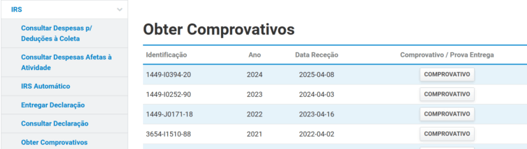 Na página do IRS no Portal das Finanças, no menu lateral do lado esquerdo, clique na opção “Obter comprovativos”.